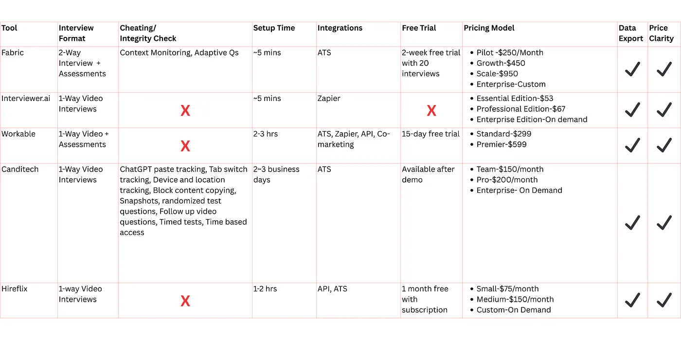 - Fabric: Two-way adaptive interviews with follow-ups, fraud detection, and detailed candidate reports.